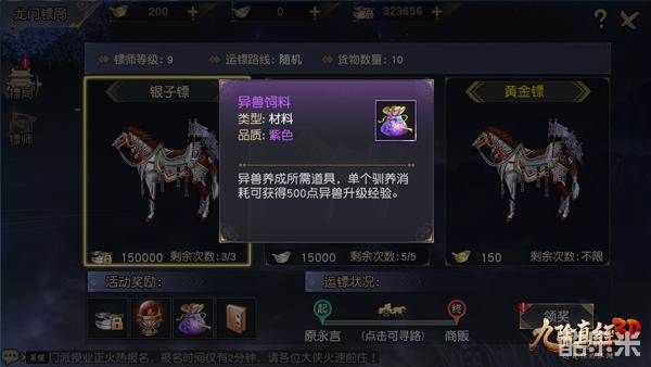 龙门镖局常年为江湖人士运送货物,甚至还会护送价值连城的物品。如果玩家有幸接到此类镖车,将得到异常丰厚的奖励。完后才能运镖的玩家可以获得大量经验奖励,祝你迅速提升等级!此外,异兽饲料和异兽丹也是押镖的犒劳,这些物资极为珍贵,能帮助玩家培养异兽等级,提升战力。最刺激的是,玩家还有机会获得黄金货币大奖。黄金是游戏中名副其实的硬通货,为了这份大礼,再辛苦也值了!